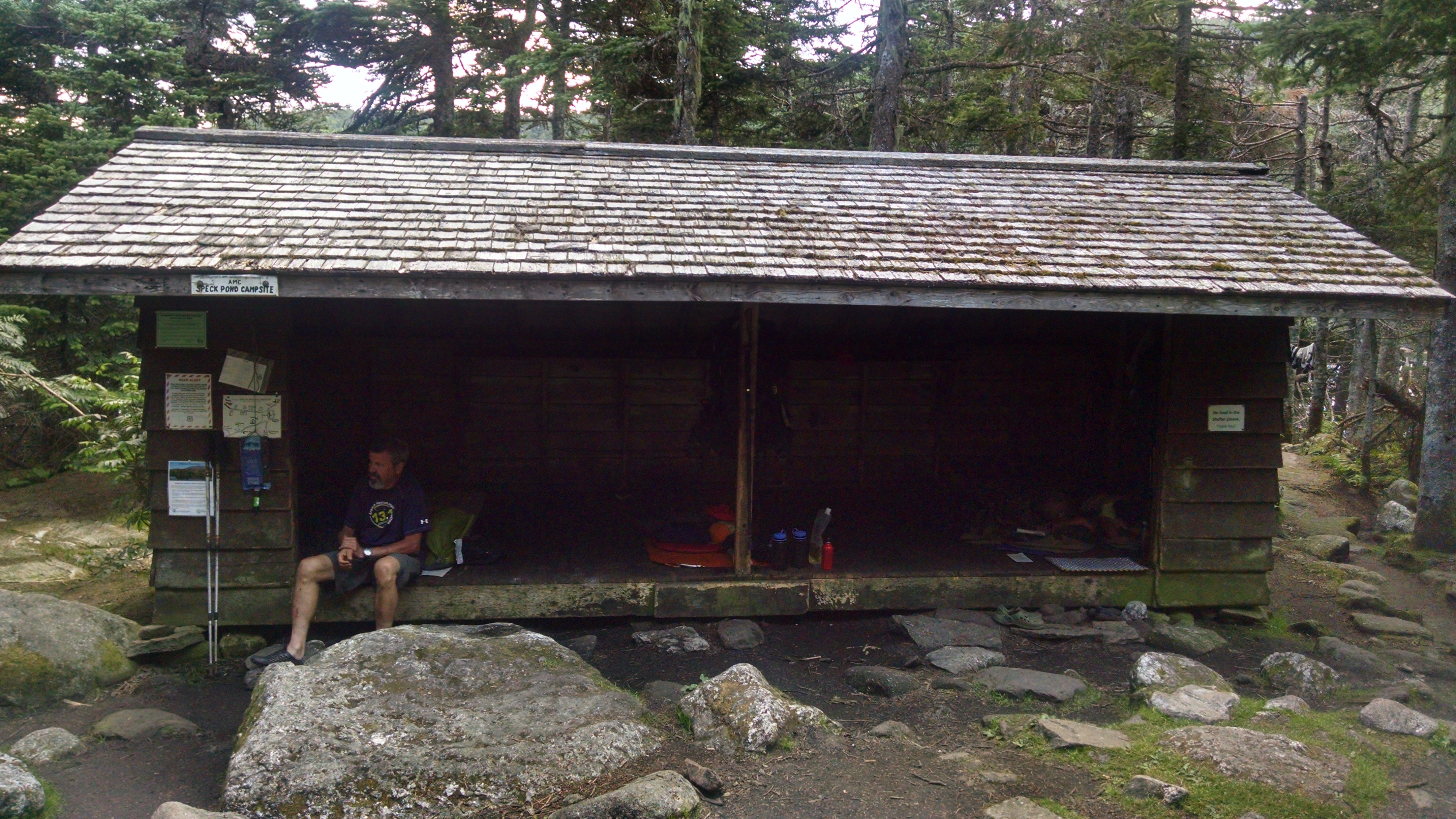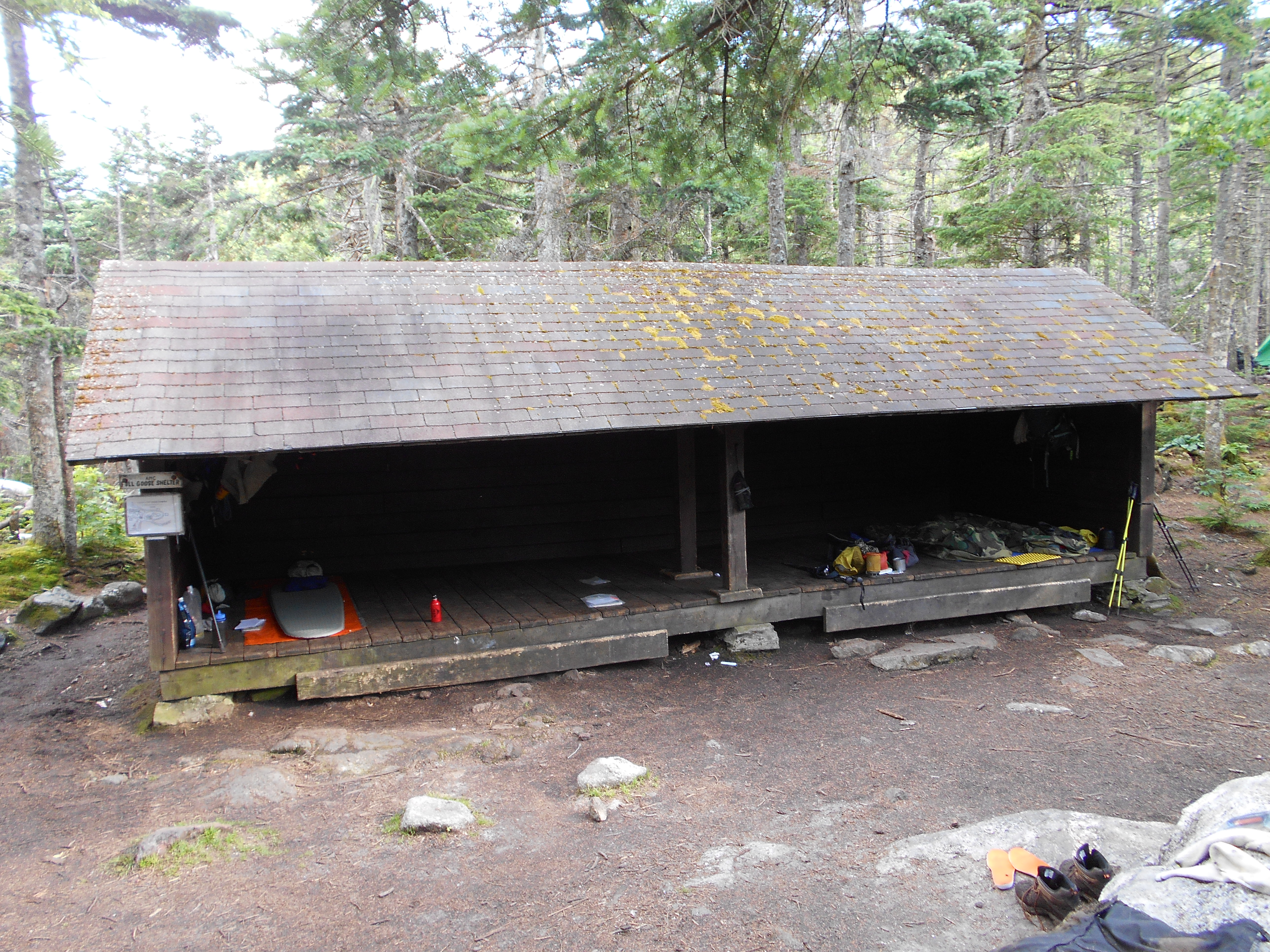 the plan was to go to full goose shelter some 4.5 miles beyond but arrived here at 3 after hiking 7 hours (including breaks) and just knew I would not reach it in good time so I stopped. hiking went from easy to rediculously impossible. on carlos col I backtracked three times saying "they just wouldnt make hikers do that" but I was wrong! dont know if the morning wetness (rained all night) sucked the energy out if me, or I didn't sleep well last night, or if it was something else, but the miles were just coming very slow today. hate to loose 50+ right befor mahoosec notch and arm, but I cant go further today....I am just wiped. Time for a nap before dinner.